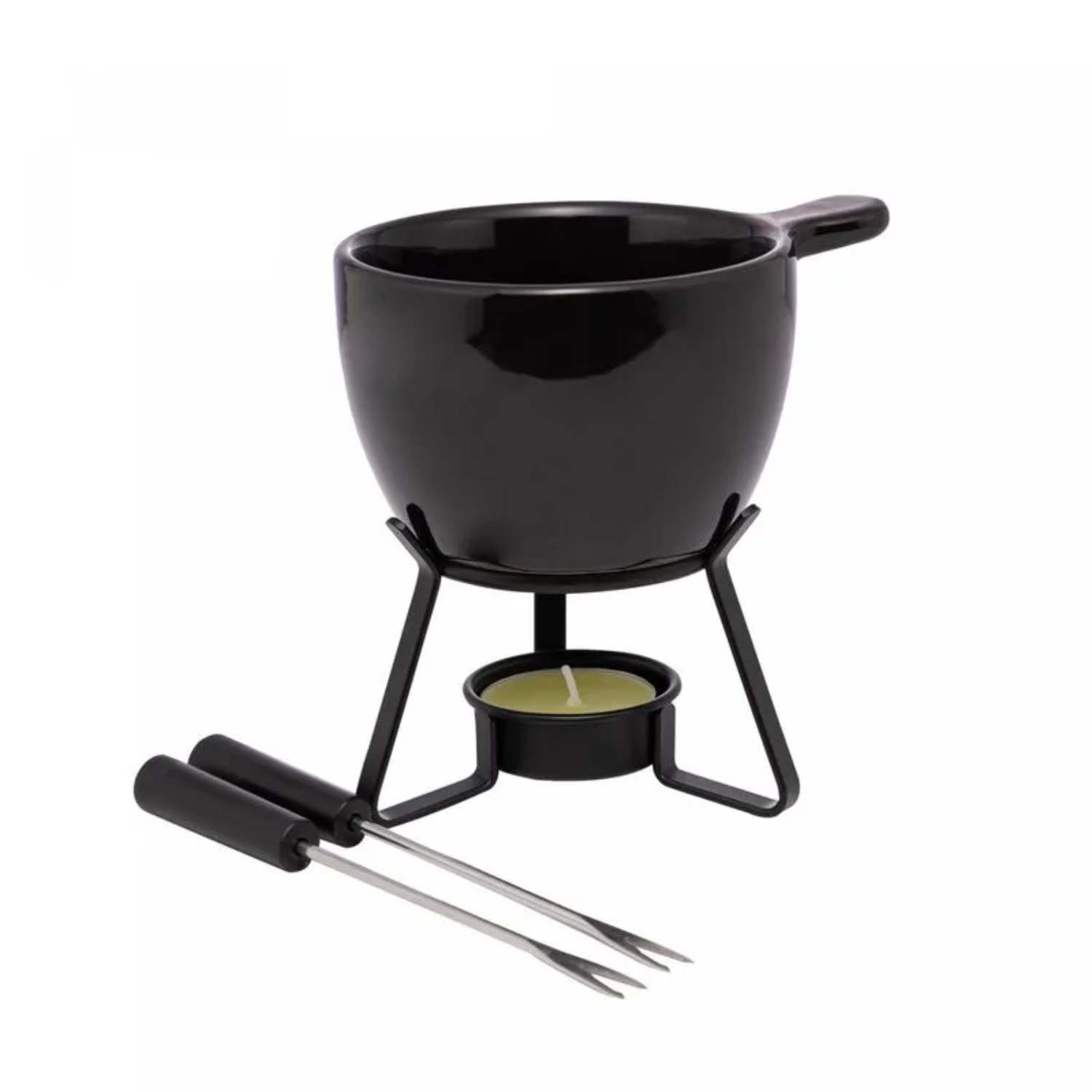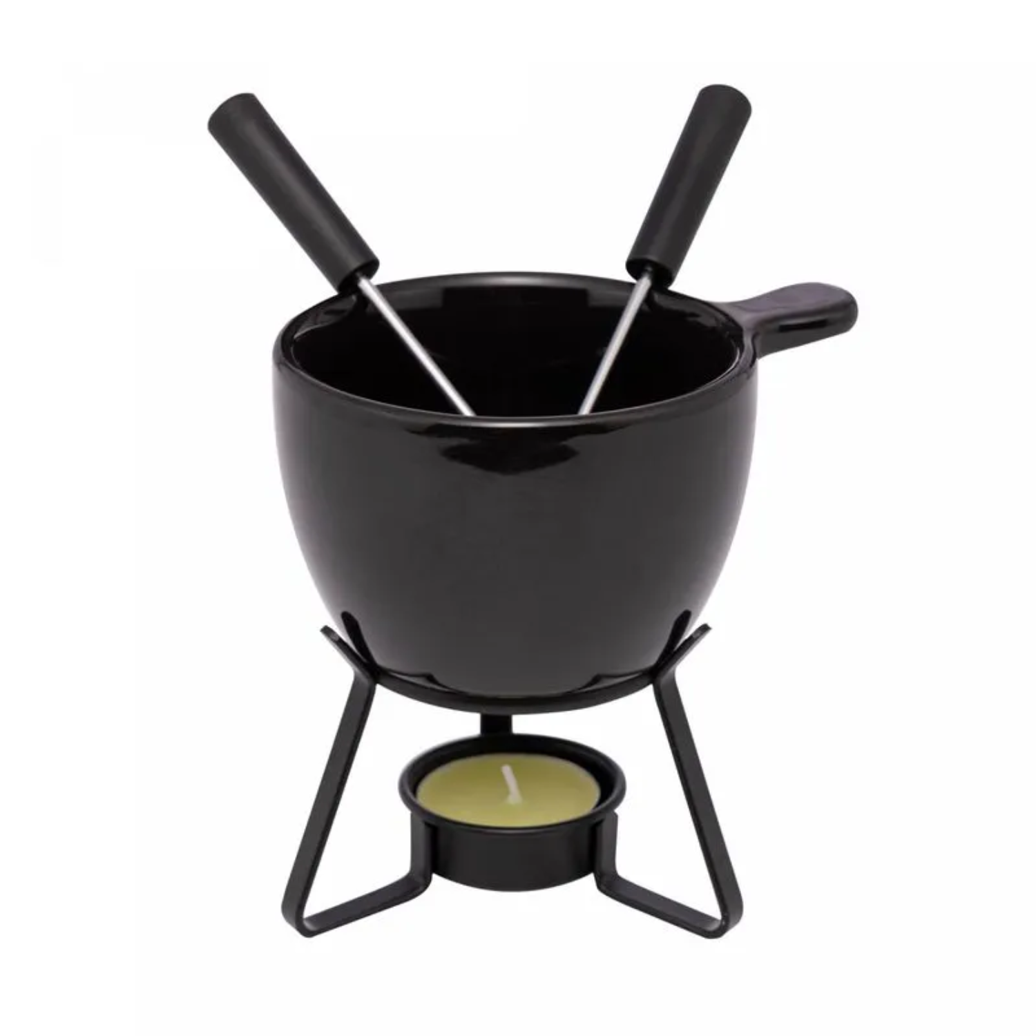 Material: Cerâmica e Metal; Capacidade da Panela: 250ml; Itens inclusos: Panela, Suporte, 4 Garfos; Dimensões: 20cm x 15cm x 10cm