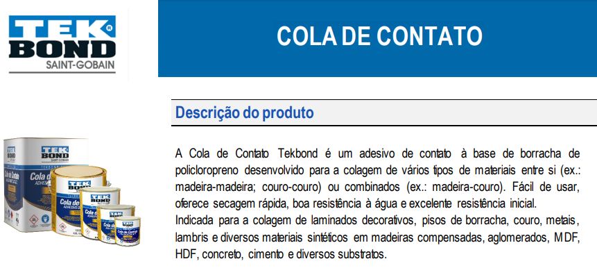 Marca: Tekbond; Modelo: Cola de Contato; Peso: 400g