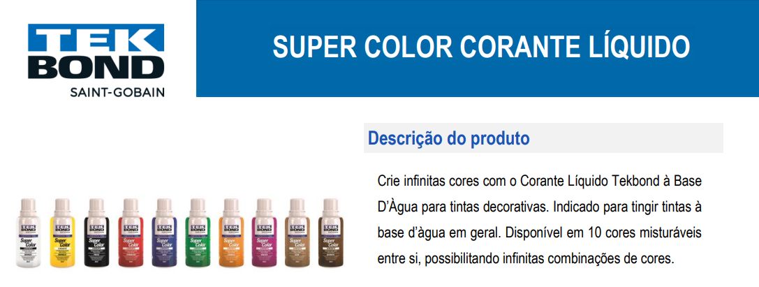 Capacidade: 50ml; Marca: Tekbond; Tipo: Corante Líquido; Uso recomendado: Projetos de artesanato, cosméticos, velas, entre outros.
