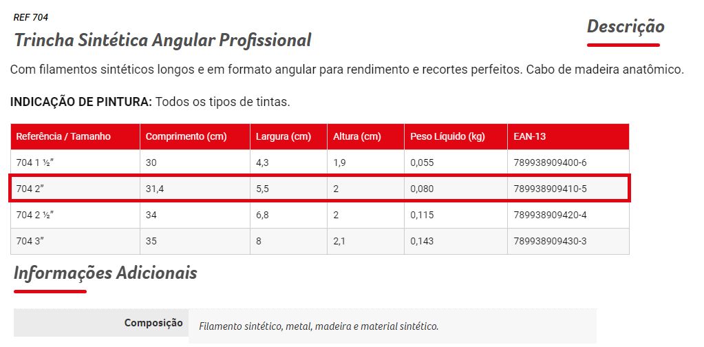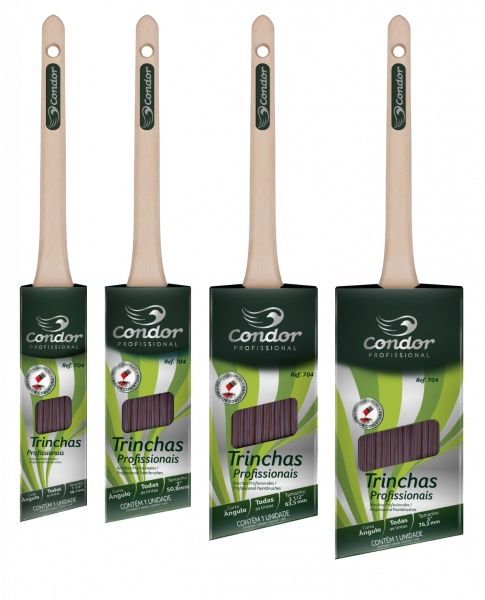 Marca: Condor; Modelo: 704; Tipo: Trincha Angular; Material cerdas: Sintético; Comprimento cerdas: 2 polegadas; Indicado para: Pinturas detalhadas e precisas