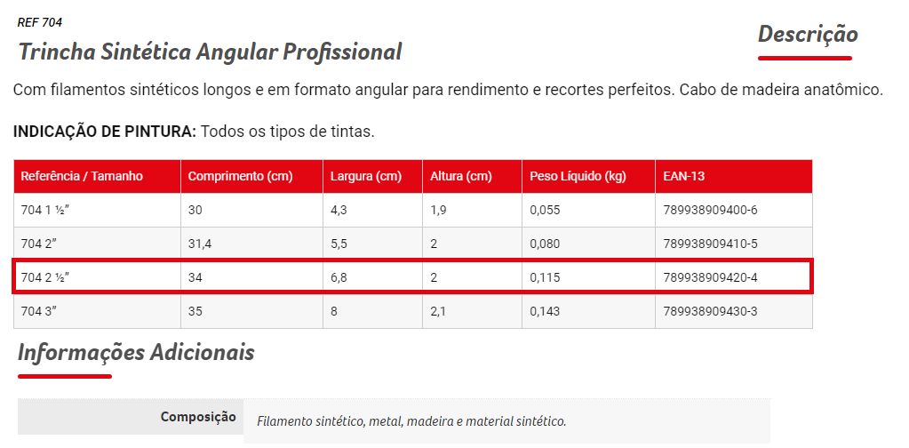 Marca: Condor; Modelo: Trincha Angular 704; Tamanho: 2.1/2 polegadas; Material: Cerdas sintéticas; Formato: Angular; Uso: Pintura em geral.