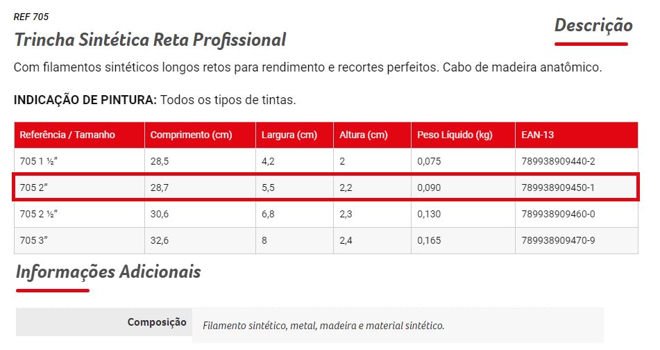 Modelo: Trincha Reta 705 2 Condor; Material: Cerdas sintéticas de alta qualidade; Indicado para: Pinturas em geral; Tamanho: 2 polegadas; Marca: Condor.