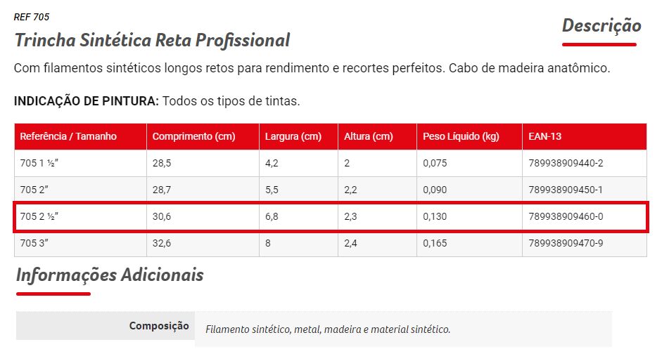 Marca: Condor; Modelo: 705; Tipo: Trincha Reta; Tamanho: 2.1/2 polegadas; Material: Cerdas resistentes; Indicado para: Pintura em geral.