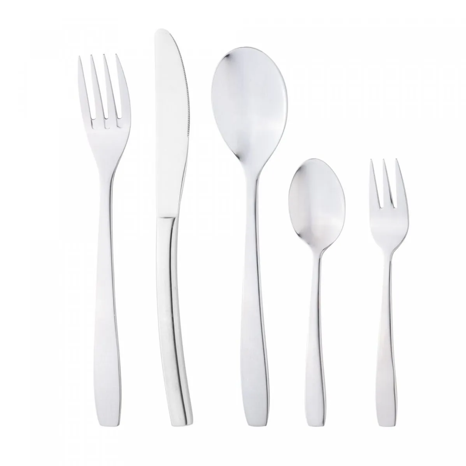 30 peças: 6 facas de mesa, 6 garfos de mesa, 6 colheres de mesa, 6 garfos de sobremesa e 6 colheres de chá.