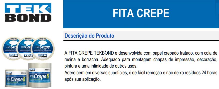 Dimensões: 18mm x 50m; Marca: Tekbond; Material: Fita crepe; Cor: Branco