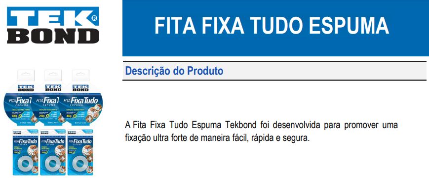 Tipo: Fita dupla face de espuma Dimensões: 12mm x 1,5m Marca: Tekbond Aplicação: Uso em ambientes internos Características: Adesivo forte e durável Ideal para: Fixações diversas em superfícies diferentes
