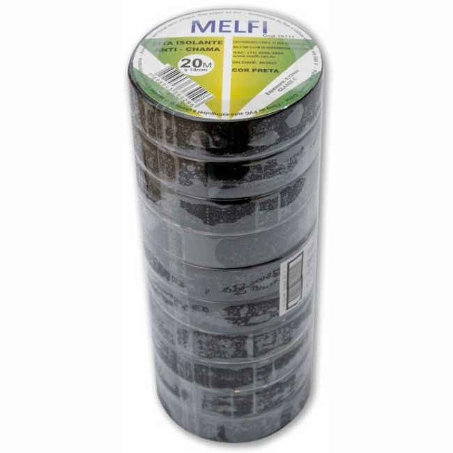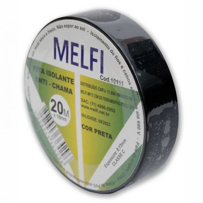 Tamanho: 18mm x 20m; Marca: Melfi; Material: PVC; Cor: Preto; Uso: Instalações elétricas; Resistência: Alta; Aderência: Excelente