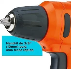 Marca: Black & Decker; Modelo: LD12S; Tensão: 12V; Peso: 1,2kg; Bateria de íons de lítio; Mandril de aperto rápido 3/8" (10mm); Velocidade variável e reversível; Ajuste de torque: 11 posições; Iluminação de LED; Carregador bivolt incluso.