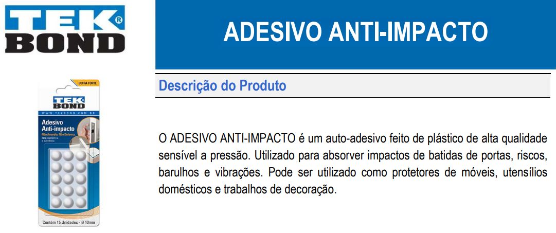 - Marca: Tekbond - Tipo: Protetor Adesivo Anti Impacto - Espessura: 10mm - Material: Resistente e durável - Indicado para: Proteger superfícies contra impactos e arranhões