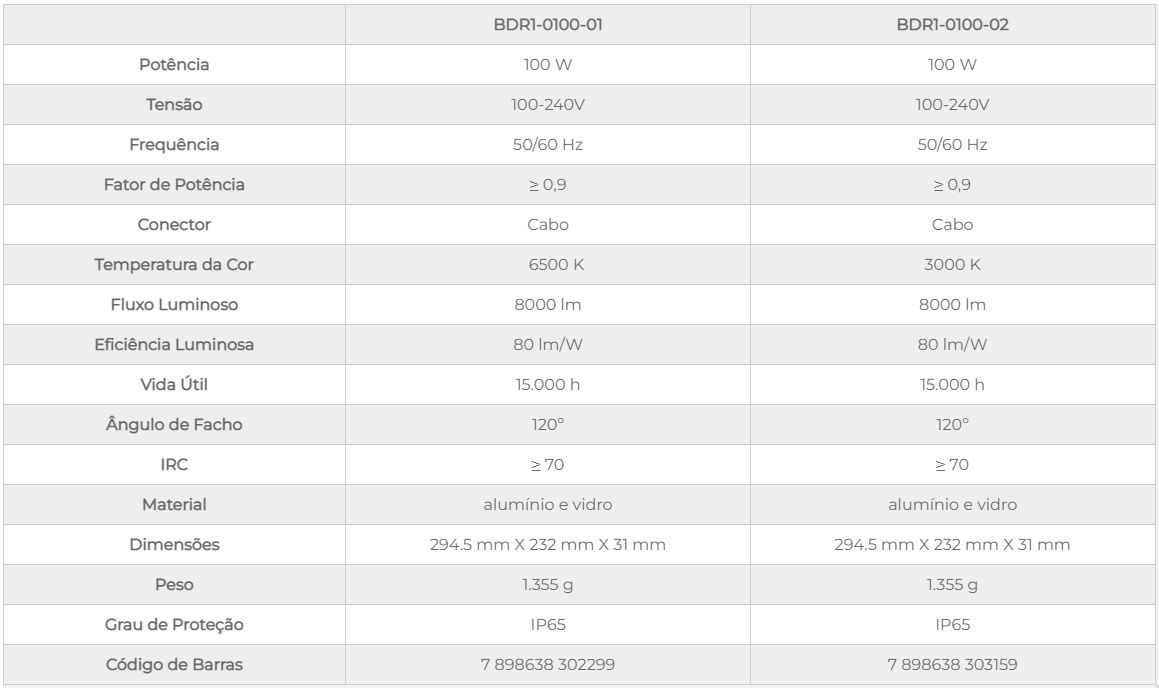 Potência: 100W, Temperatura de cor: 6500K, Proteção: IP65, Design moderno e resistente.