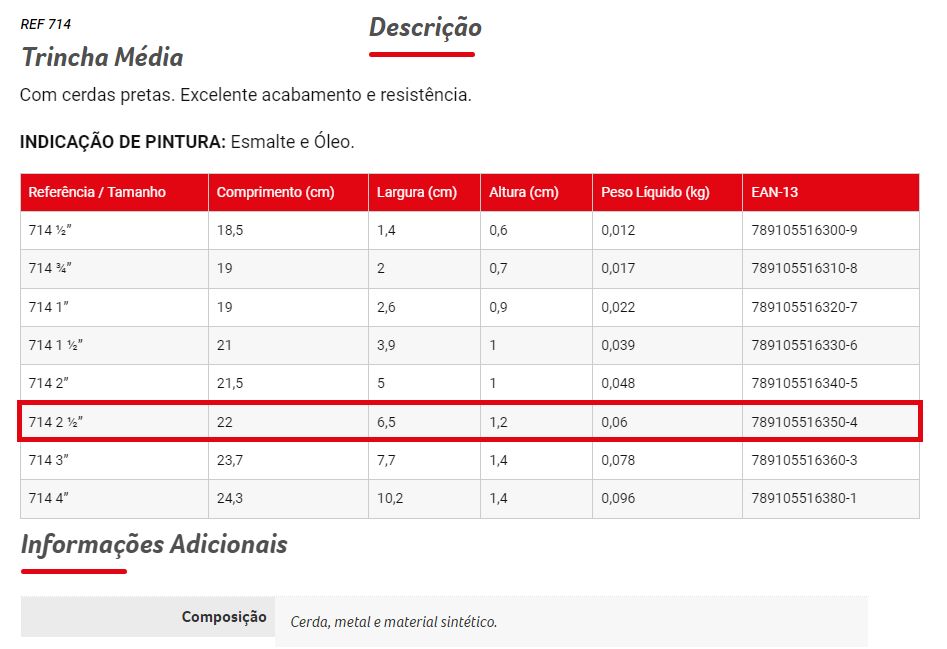 Marca: Condor; Modelo: TRINCHA 714; Tamanho: 2.1/2 polegadas; Tipo de cerdas: Macias e resistentes; Cabo: Ergonômico; Indicado para: Pinturas em geral.