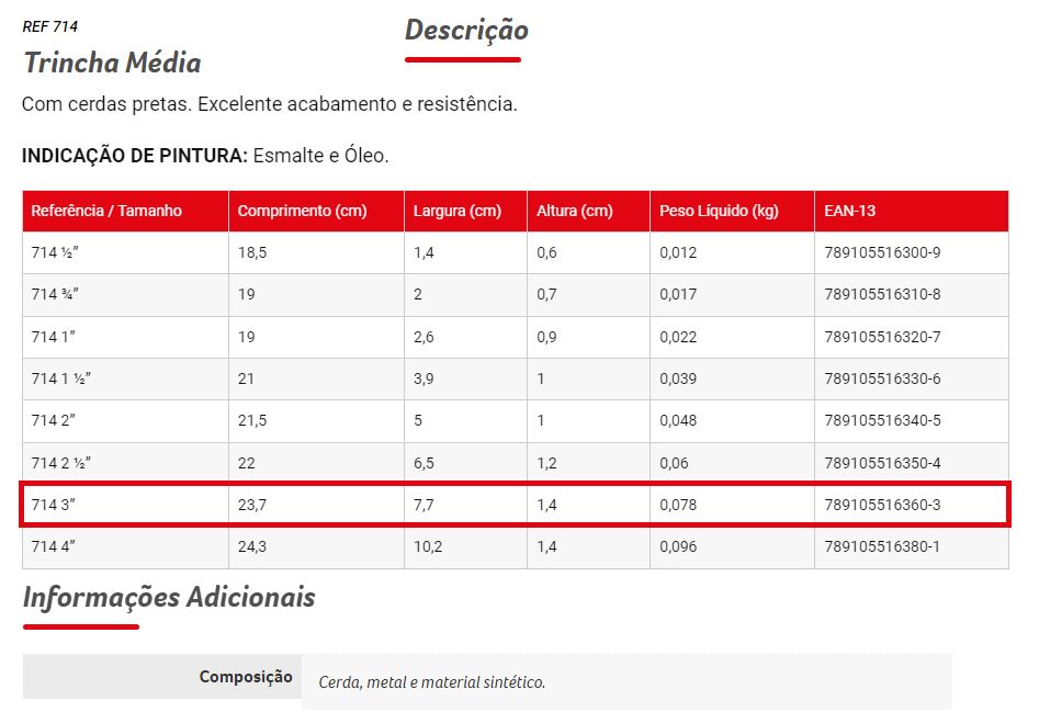 Marca: Condor Modelo: 714 3 Tamanho: 3 polegadas Material: Cerdas sintéticas e cabo de plástico Indicado para: Pinturas internas e externas Cor: Marrom e preto Peso: 100g Dimensões: 20 x 5 x 2 cm