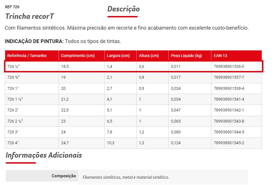Modelo: TRINCHA 726 1/2 Marca: Condor Tamanho: 1/2 Cerdas macias e resistentes Cabo ergonômico para maior conforto Indicada para pinturas precisas e detalhadas