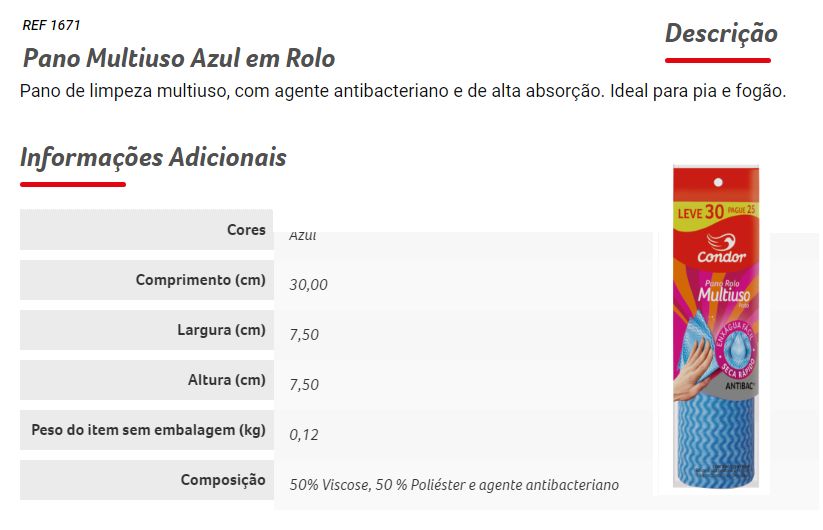 Cor: Azul; Marca: Condor; Material: Tecido resistente; Ideal para: Uso doméstico; Dimensões: Aprox. 30cm x 40cm.